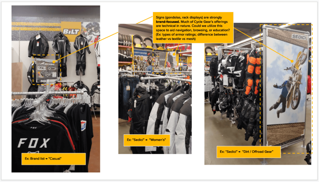 To generate ideas outside the motorcycle industry but in similar enthusiast markets, I also visited several outdoor and athletic retail stores to better understand an expanding trend in experiential retail.