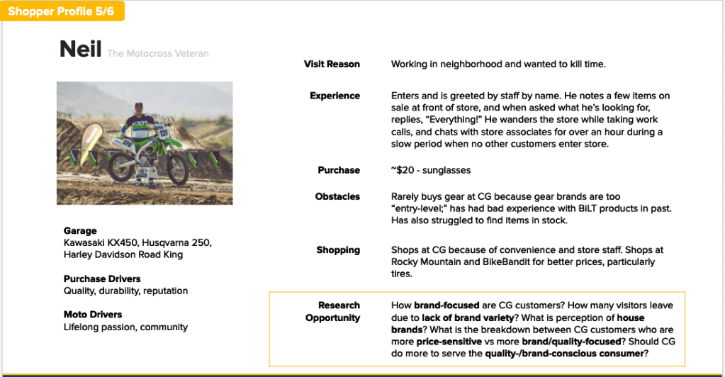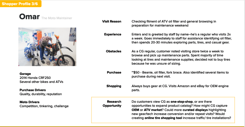 One internal challenge I found in this project was humanizing, and creating empathy for, our sister company’s retail customers. To bring customer voices to the discussion on our retail shoppers, I created a series of “shopper profiles” to summarize different customer interviews. I included pertinent information, such as their motorcycle model, riding frequency, and brand preferences, as well as deeper details such as their reason for purchase, who they shopped for. Because this was foundational research, each profile was associated with further research and business opportunities.