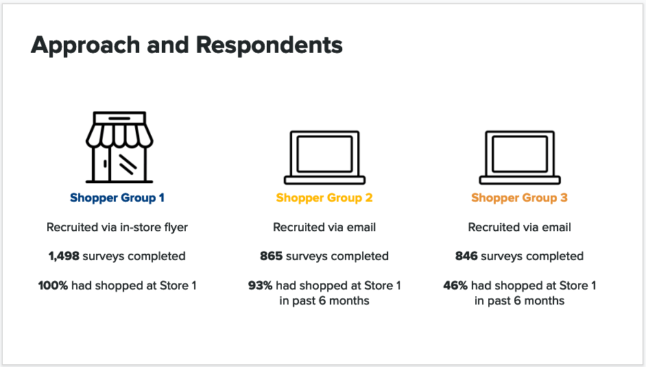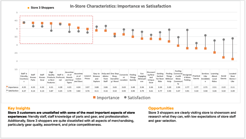 After in-store observation and customer interviews, we felt ready to quantitatively evaluate customers’ in-store experiences. We created a survey focused on understanding two key aspects: 1) the most important aspects of the retail experience, and 2) customer satisfaction of those aspects. We collected close to 3,000 completed online surveys across three groups: in-store shoppers who had received a promotional survey flyer, as well as two online shopper cohorts who indicated shopping at a store location in the past year.